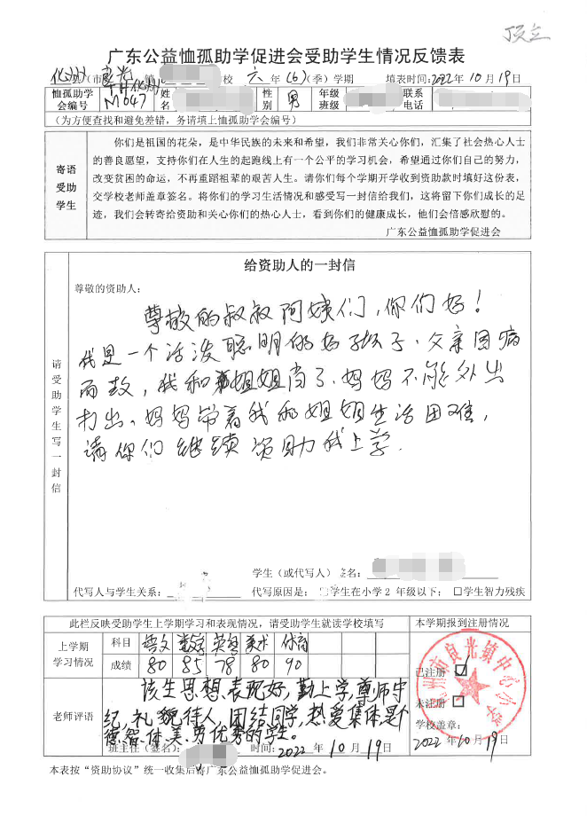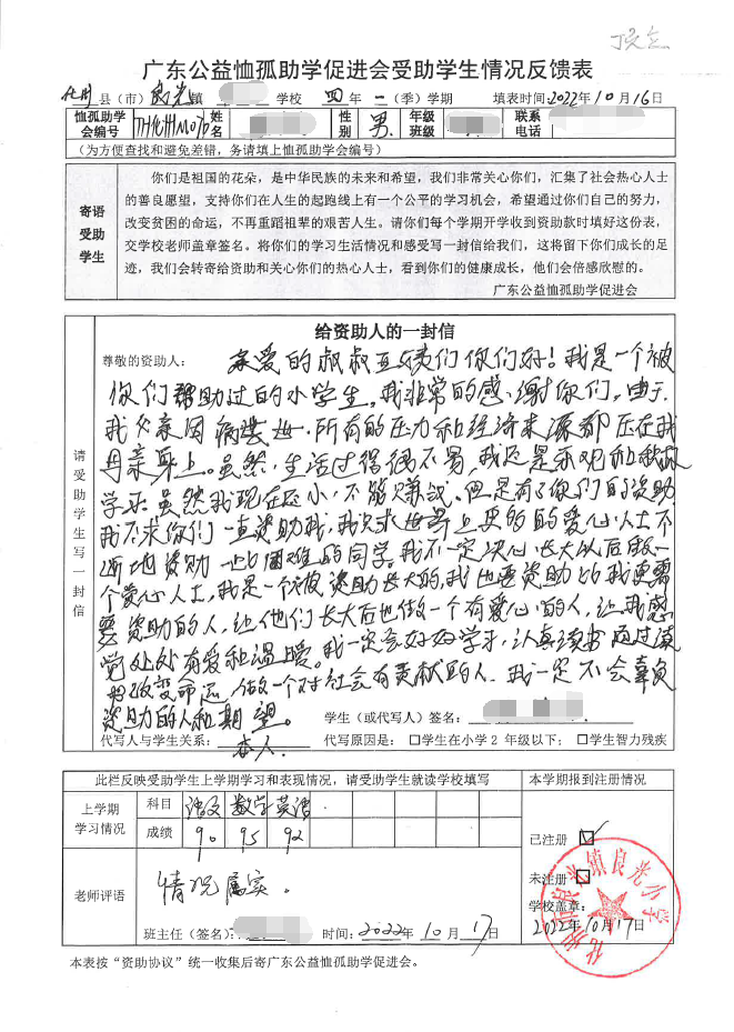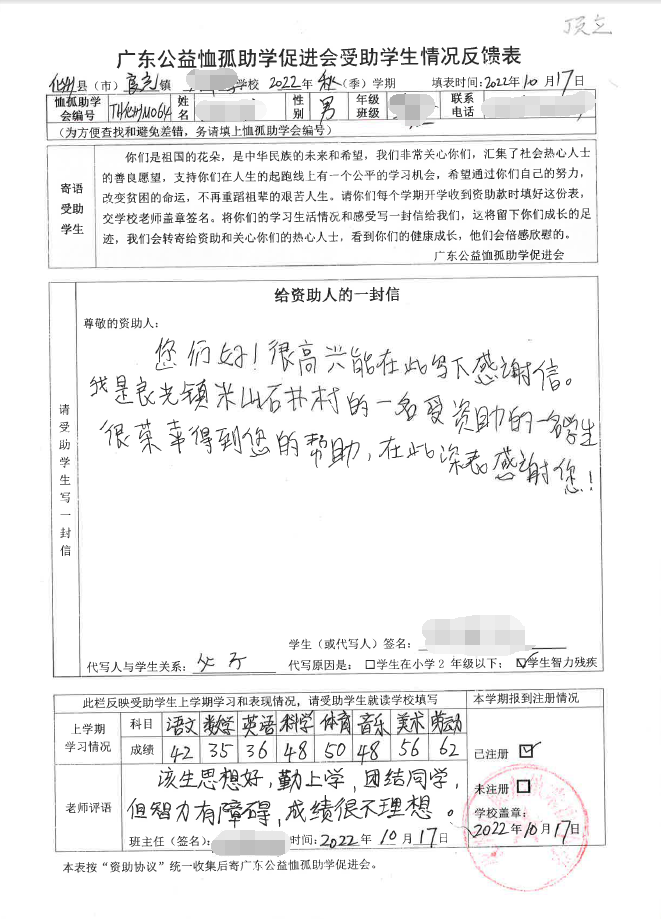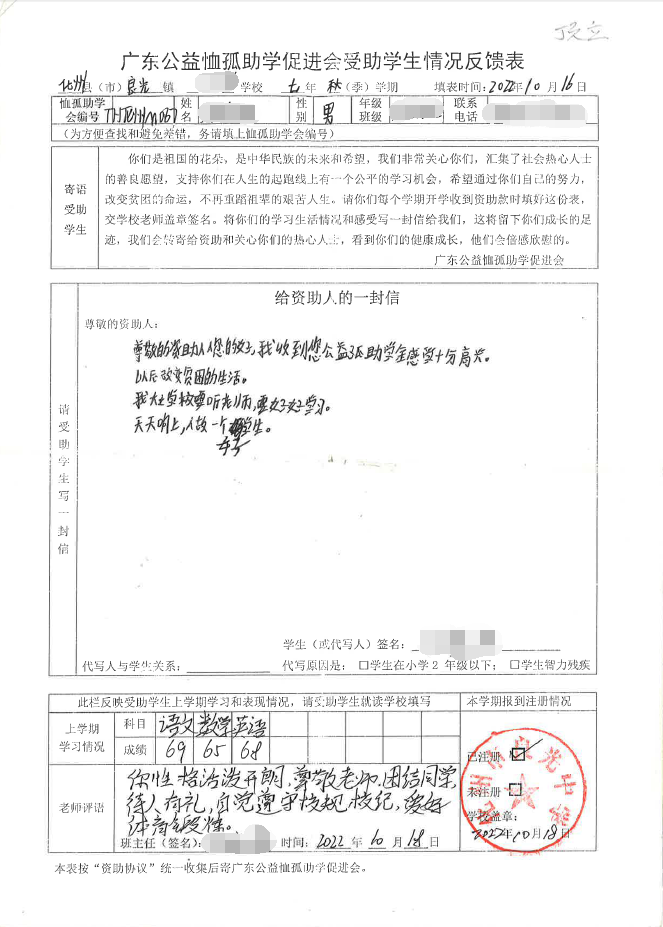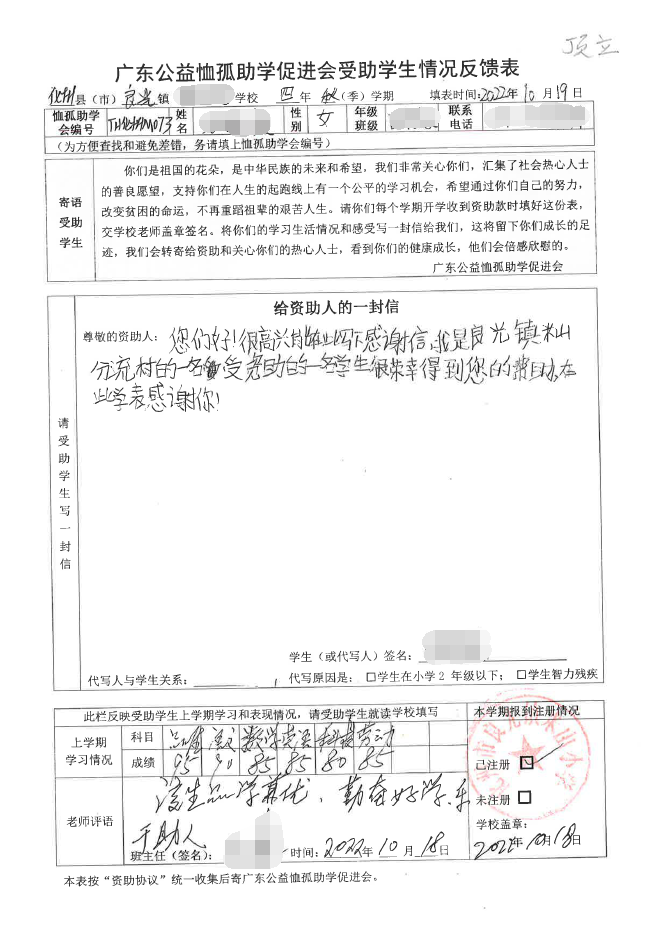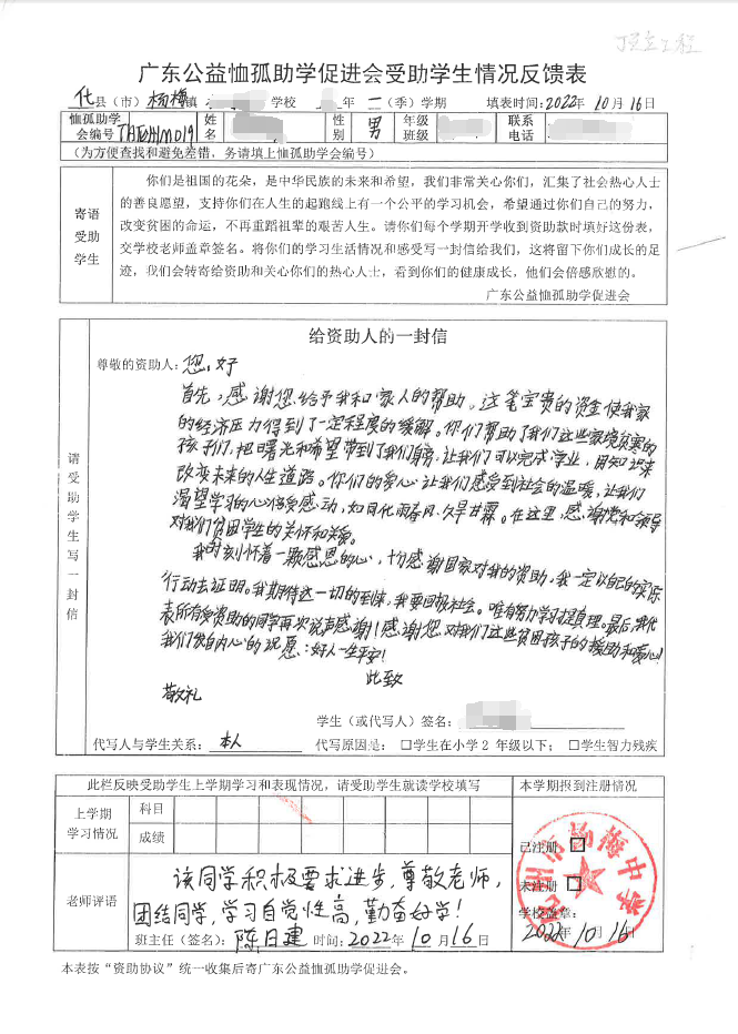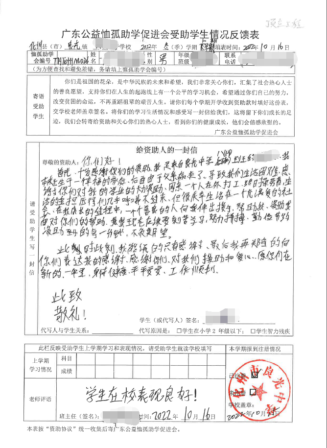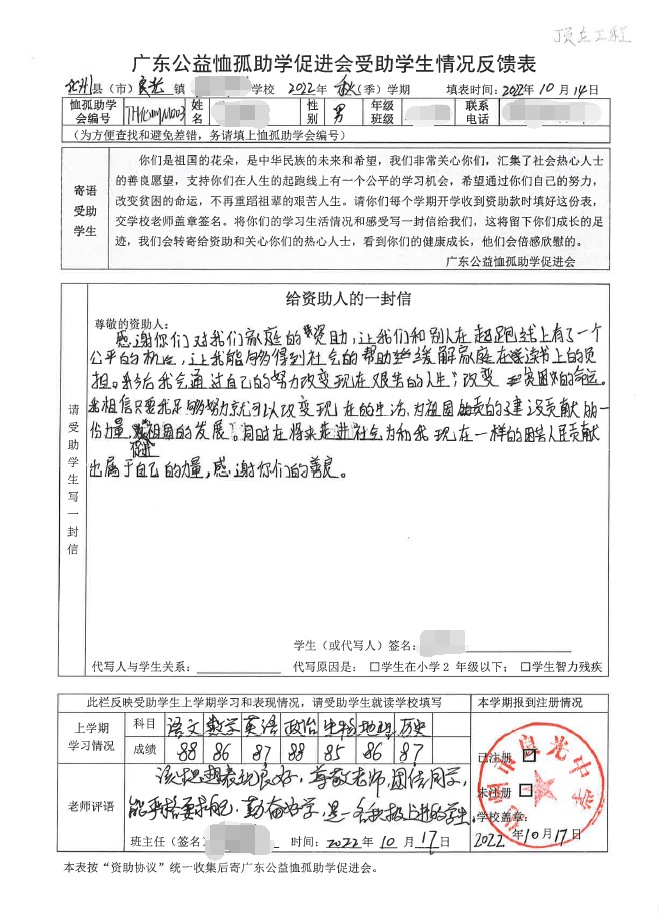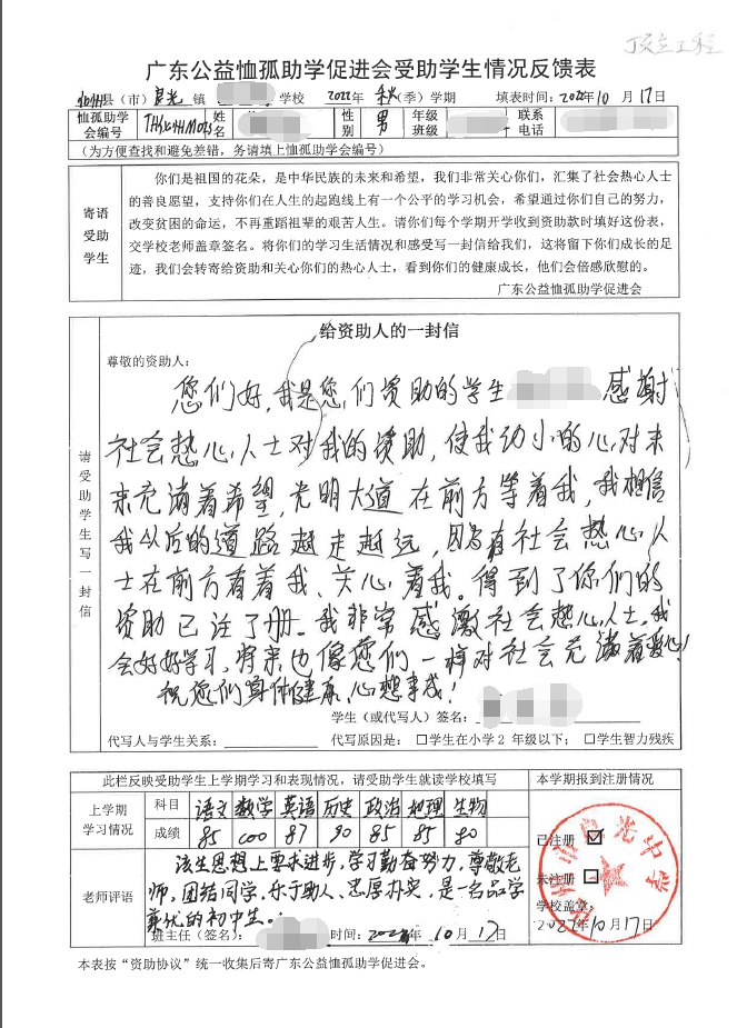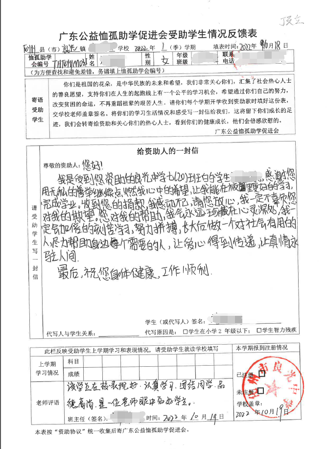 2022年7月,公司了解到广东公益恤孤助学促进会举办慈善助学活动之后,发起了公司内部慈善捐款活动,员工们积极参与,纷纷捐款,向有需要的学生奉献爱心,向他们表达一份关爱。也许官方网站的爱心微不足道,但却缓解了他们在学业上一定程度的经济压力,改善了他们的学习和生活环境,也给他们带来了希望。近期,广东公益恤孤助学促进会将学生情况反馈表及受助学生对捐助人的一封信邮寄到公司,反馈了受助学生的学习生活情况,反馈表及信函里记录着受助学生对学习的热爱,也表达着他们对捐助人的感激之情,可以说官方网站小小的举动给他们带来了莫大的支持。